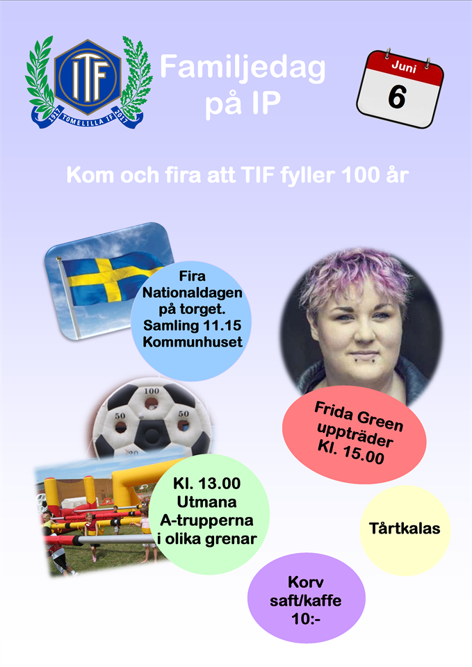 Kom och fira att TIF fyller 100 år 2017. Nationaldagen den 6 juni firar vi på torget och idrottsplatsen. Alla spelare och ledare (fotboll och handboll) och deras familjer är välkomna. Vi träffas tiffaklädda kl 11.15 vid kommunhuset för först firande på torget. Vid 13.00 sätter vi igång firandet på IP. Det kommer att finnas olika aktiviteter att gå runt på under dagen och spelare från våra A-trupper (fotboll, dam/herr och handboll) kommer att finnas på plats för att utmanas i de olika grenarna. 15.00 gästas vi av Frida Green som kommer att spela och sjunga för oss från scenen, bla. Johnny G (The Guidetti Song). Vi avslutar firandet med tårtkalas. Korv och saft/kaffe säljs under dagen för 10:-. Tomelilla IF 25 maj 2017 0kommentarer