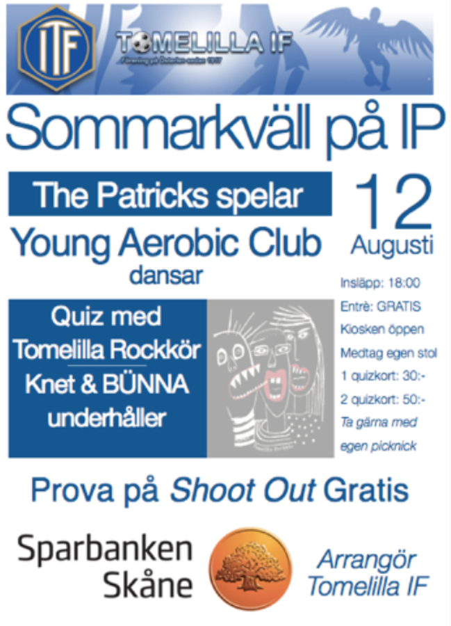 Vi tackar alla som deltog på årets Sommarkväll på IP, trots att vädret inte var det bästa blev det ändå en trevlig kväll. Tack till The Patricks och Young Aerobic Club och till Tomelilla Rockkör. Även stort tack till Knet och Bünna för quizen och underhållningen. Speciellt stort tack till alla Er som trotsade vädret och kom till IP denna kväll. Tack till våra sponsorer av priser till Quizen på Sommarkväll på IP. Rehabhuset Gym, Torget 6, A-möbler, Roger Olssons Macklivs AB, Bertils Kiosk & Gatukök, Rosengrens Järn, MFF, Lindstens Elektriska, Kebab, Tomelilla Kommun, Tomelilla Golfklubb, Olsana - Olssons Järn i Gärsnäs och Tomelilla Rockkör Tack till kvällens övriga sponsorer Sparbanken Skåne och Reimans Bröd. Bilder från kväll finns på länken Sommarkväll på IP