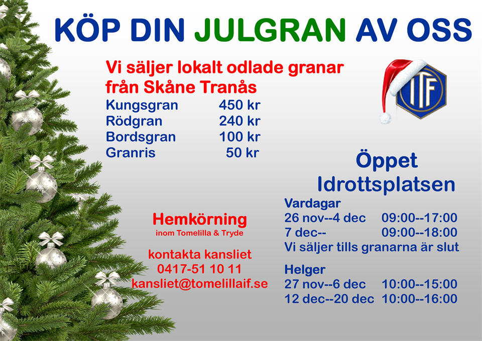 Tomelilla IF säljer lokalt odlade granar från Skåne Tranås IP. Vi kommer följa folkhälsomyndighetens råd. NYTT FÖR I ÅR TIF erbjuder gratis hemkörning av julgran inom tätbebyggt område ( Tomelilla & Tryde ) för alla som är i riskgrupperna. TIF erbjuder även ni som inte vill eller kan lämna era hem att ringa vårt kansli på 0417-511011 eller maila kansliet@tomelillaif.com där ni beskriver vilket typ av gran ni önskar(storlek osv). Sedan plockar vi ut en sådan julgran, kör och lämnar den hemma hos er. Ni betalar via swish eller säkert avstånd. TIF vill att så många så möjligt skall få njuta av julgran. Dessutom kommer ALLA, notera ALLA, som köper en julgran av TIF i år få välja något från vår loppmarknad. TIF loppis kan tyvärr inte hålla öppet i december och därför skänker vi en sak till alla som köper julgran av oss. Loppisgruppen har kört ut loppissaker till ip. Som ni alla förstår kommer ni som köper julgran tidigt ha mest loppissaker att välja på. Välkomna Tomelilla IF 22 nov 2020 0kommentarer