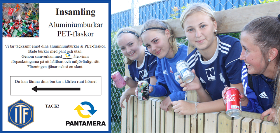 Vi tar tacksamt emot dina aluminiumburkar & PET-flaskor. Både burkar med och utan pant. Genom samverkan med PANTAMERA återvinns förpackningarna på ett hållbart och miljövänligt sätt. Nu kan du lämna dom utan att gå in på Idrottsplatsen. Strax till vänster om huvudingången. Låt dom gärna ligga kvar i bärkassen, lådan eller säcken som du transporterat dom i. Tack för att du stödjer Tomelilla IF